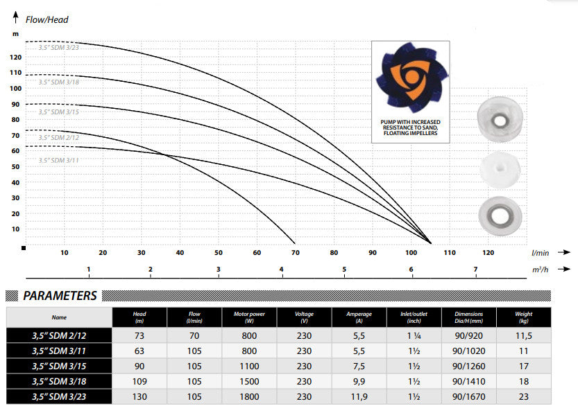 A multi-stage borehole pump with increased resistance to sand (up to 5% of sand in water). The pump has "floating impellers" and wear-resistant materials: brass, AISI 304 stainless steel, and high quality plastic materials.